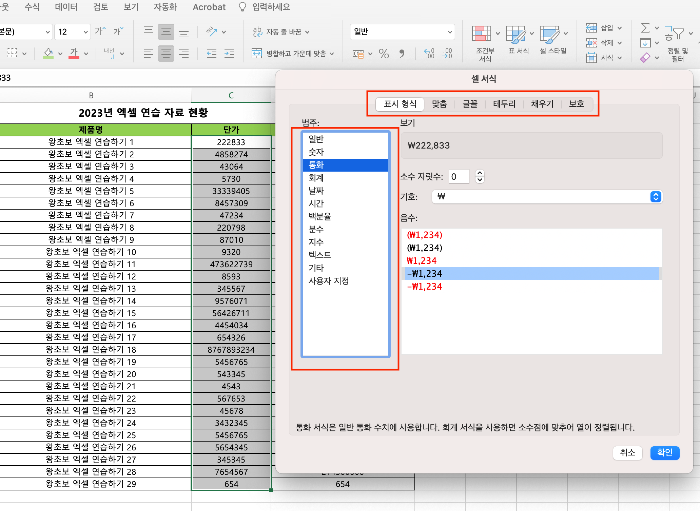 아래의 표에서 '단가'의 숫자 입력 값을 다르게 표현하고 싶을 때 가장 먼저 무엇을 해야 할까요?