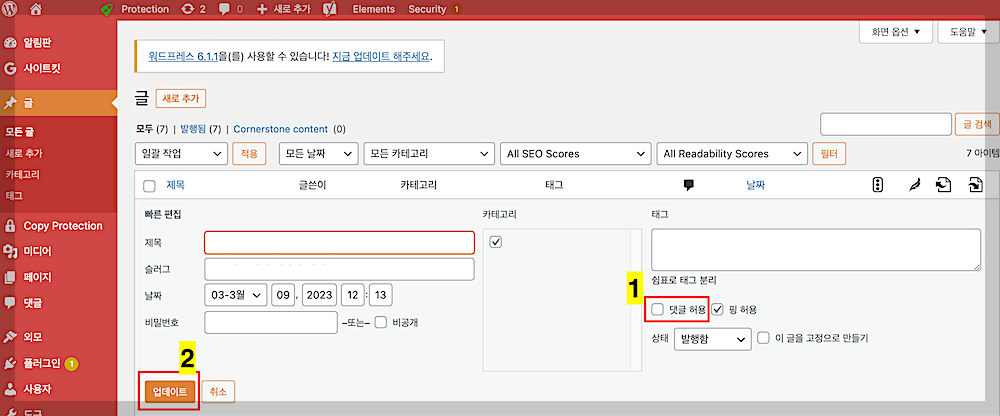 그리고 업데이트 버튼까지 클릭하면 이 글에 대한 댓글 창이 사라집니다.