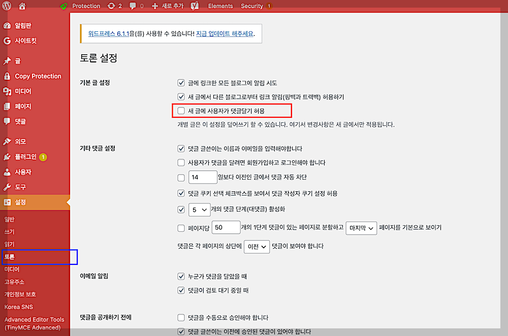 1. 토론 설정에서 댓글 창 없애기 - 새 글에 적용