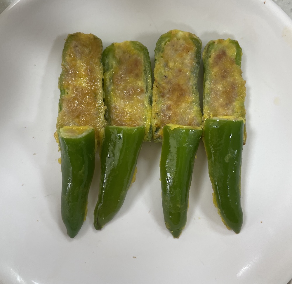 ▶ 풋고추 안쪽까지 소를 얇게 밀어 넣어 채우기 - 풋고추전을 지지면 소가 줄어들음